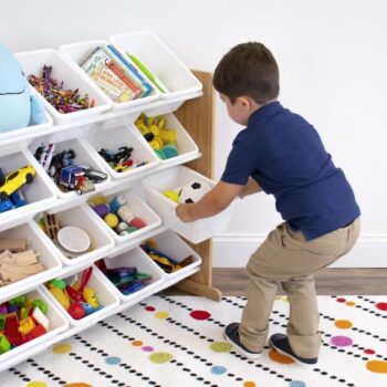 Kids Wood Toy Storage Organizer with Chalkboard and 16 White Bins